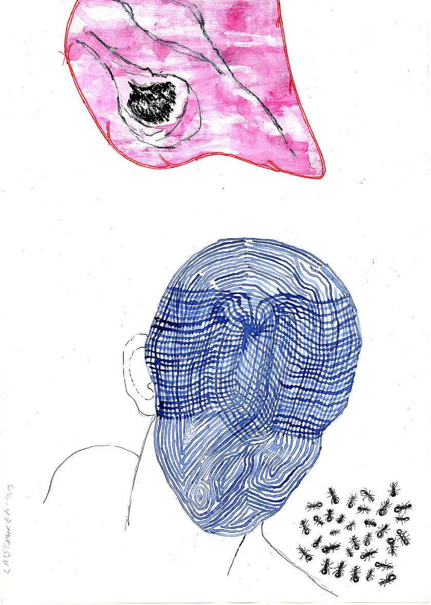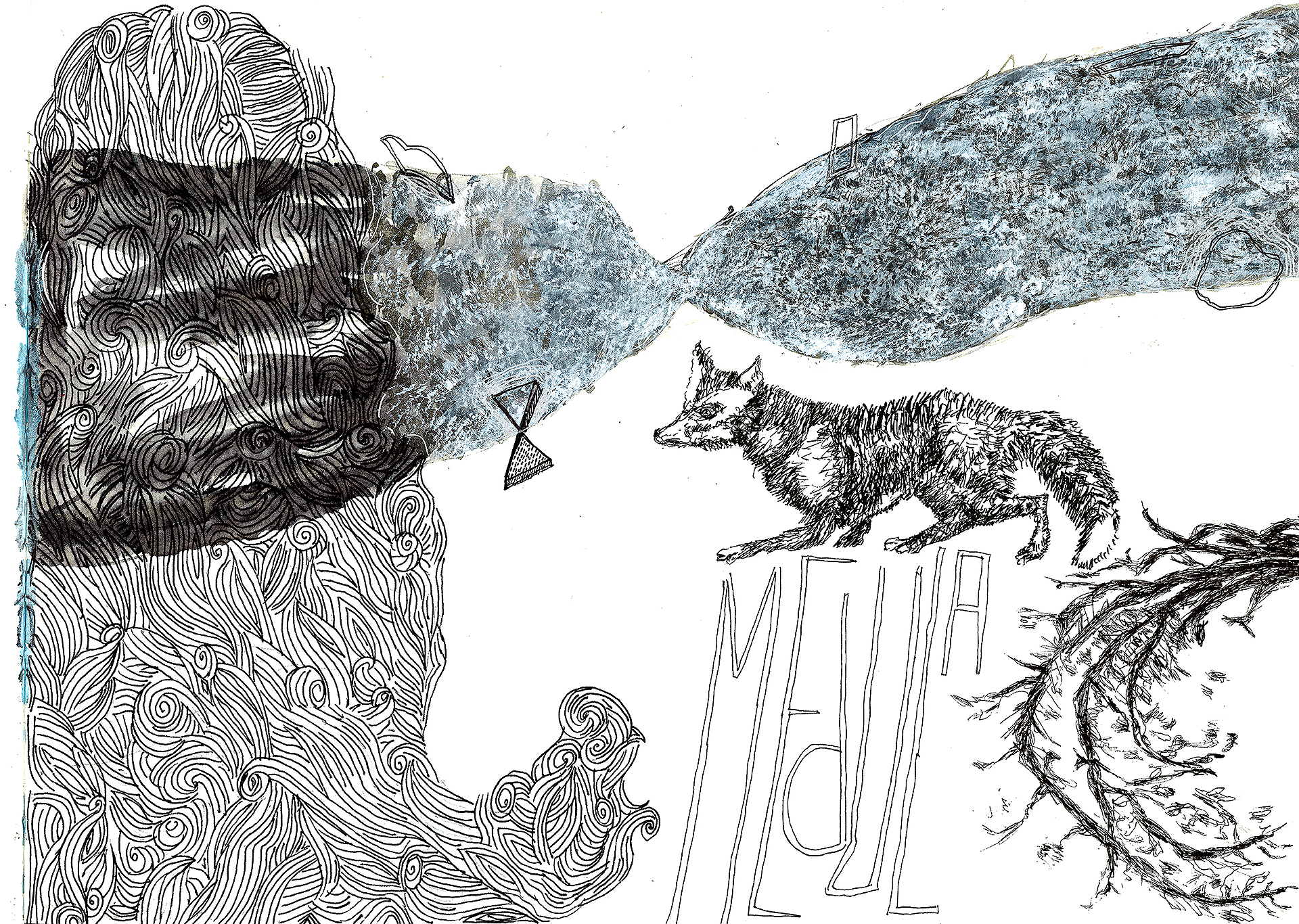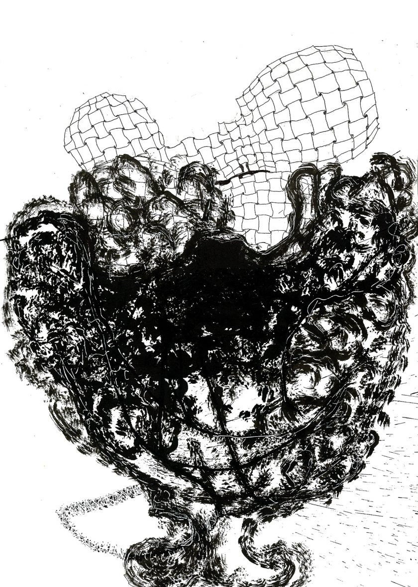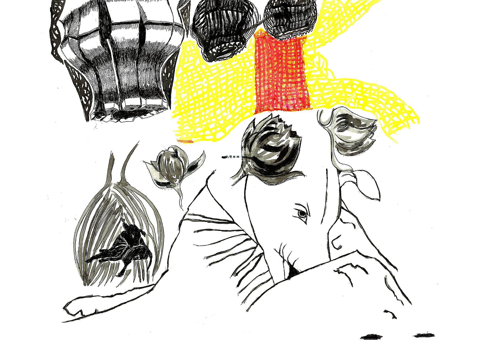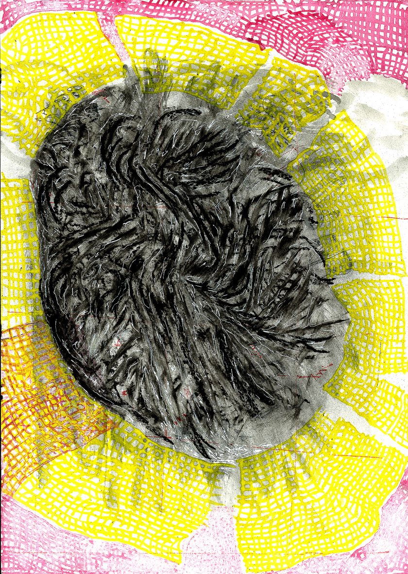 Encre de chine, charbon, crayon gras, feutre et stylo bille.