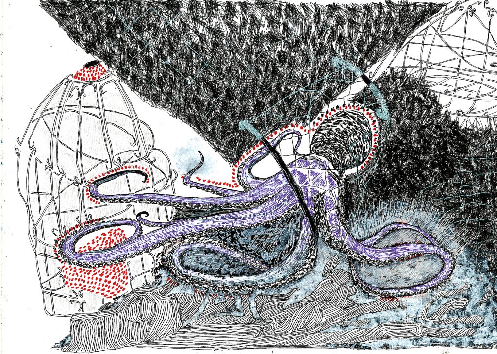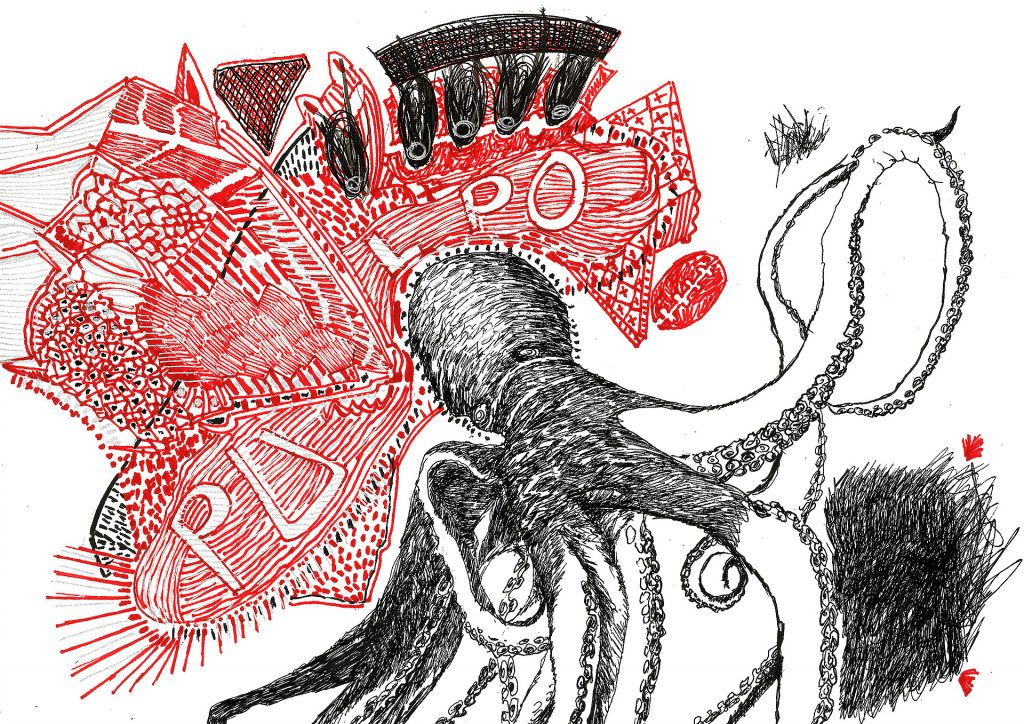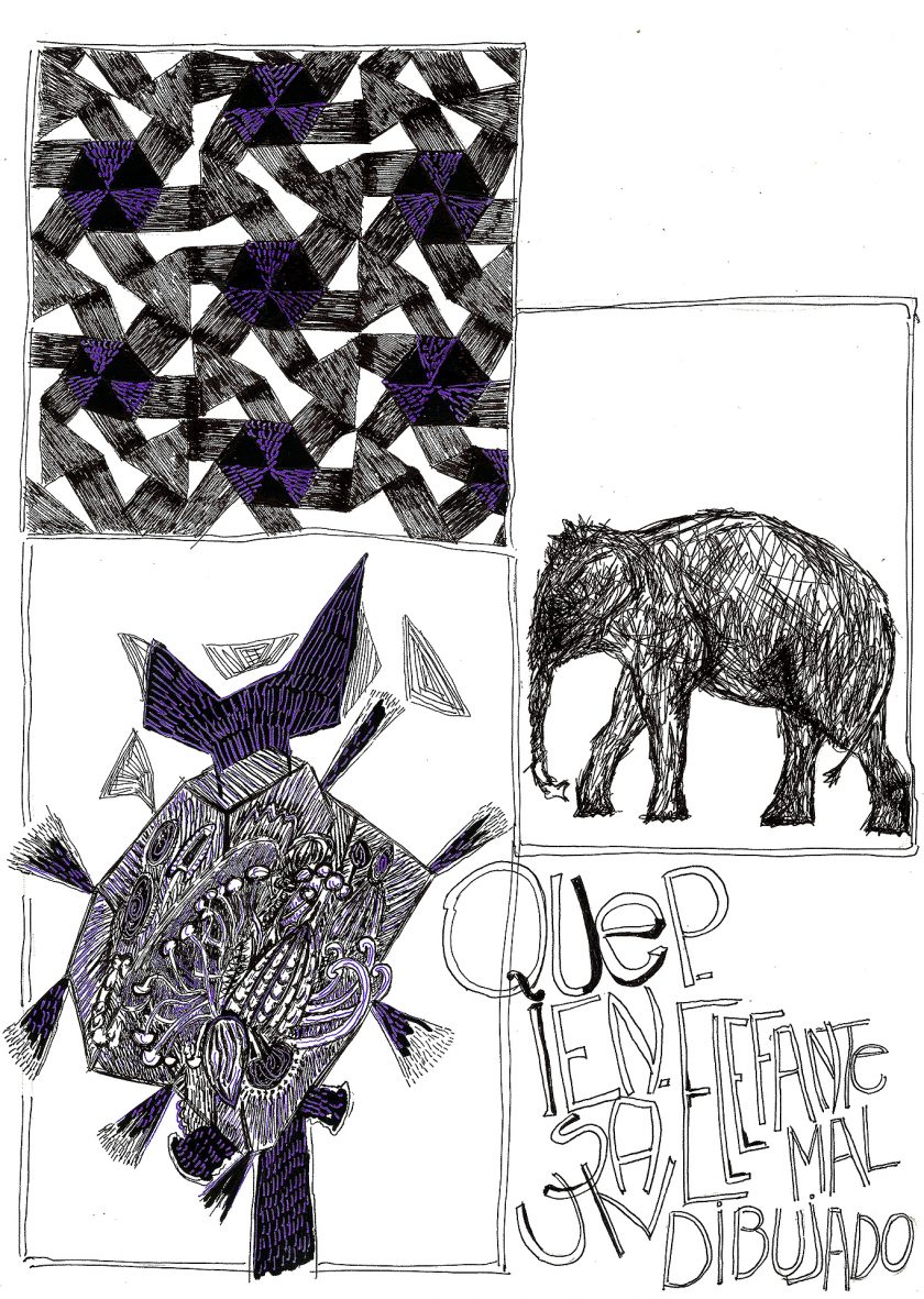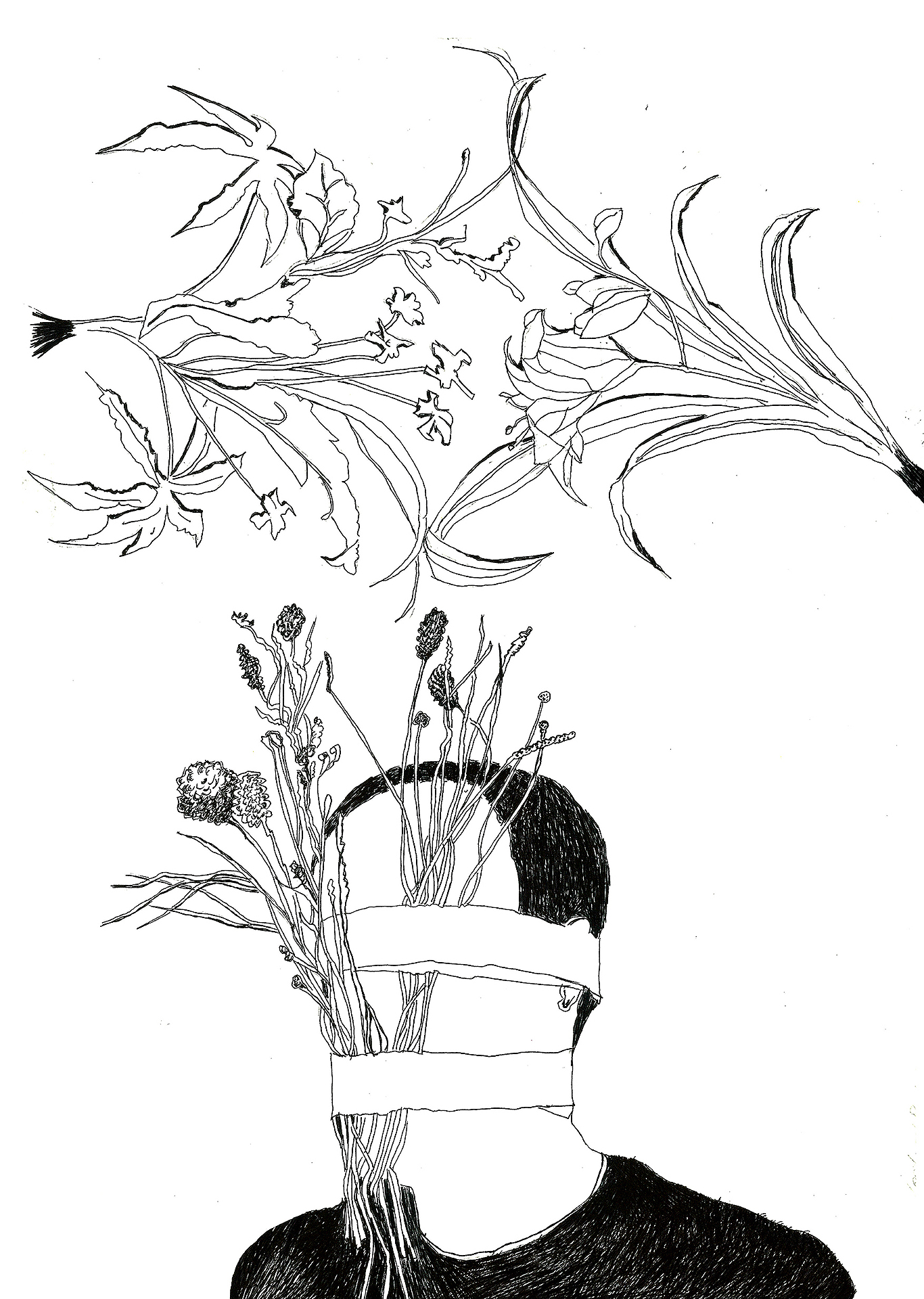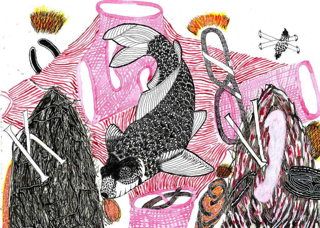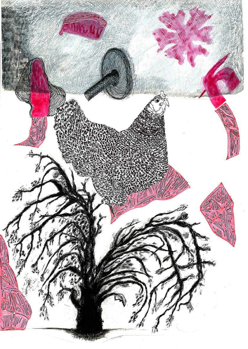 Encre de chine, charbon, crayon gras, feutre et stylo bille.