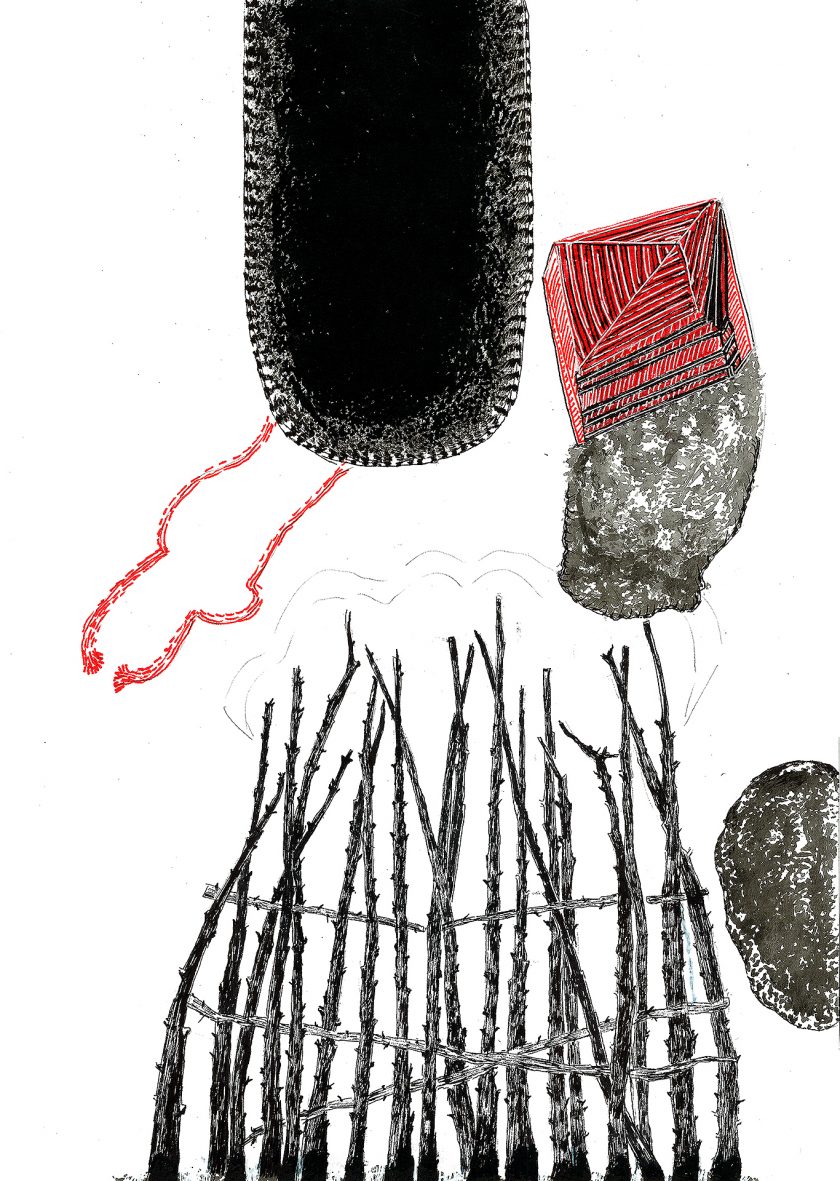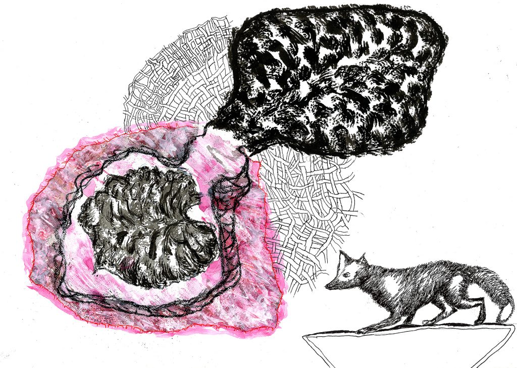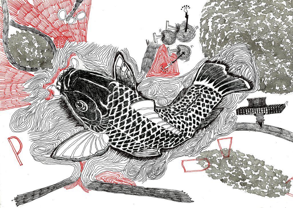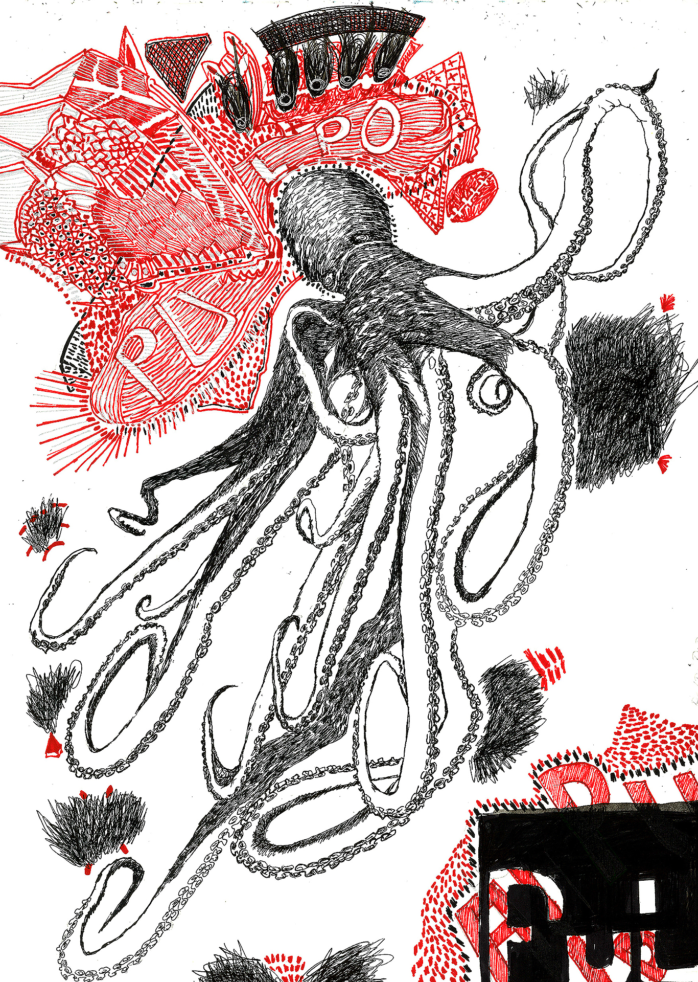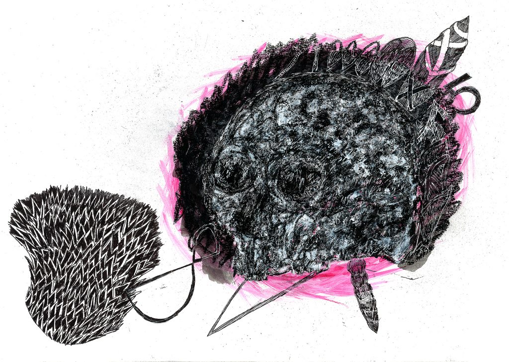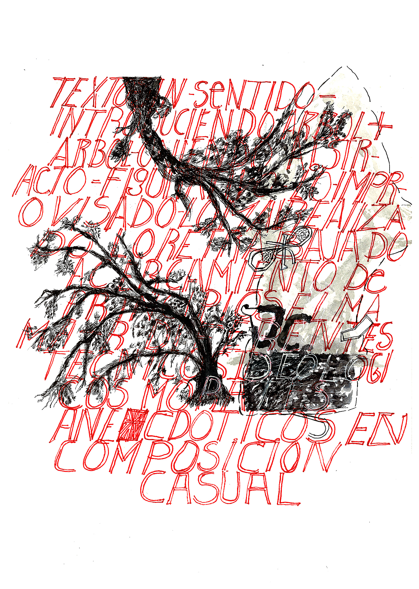 Encre de chine, charbon, crayon gras, feutre et stylo bille.