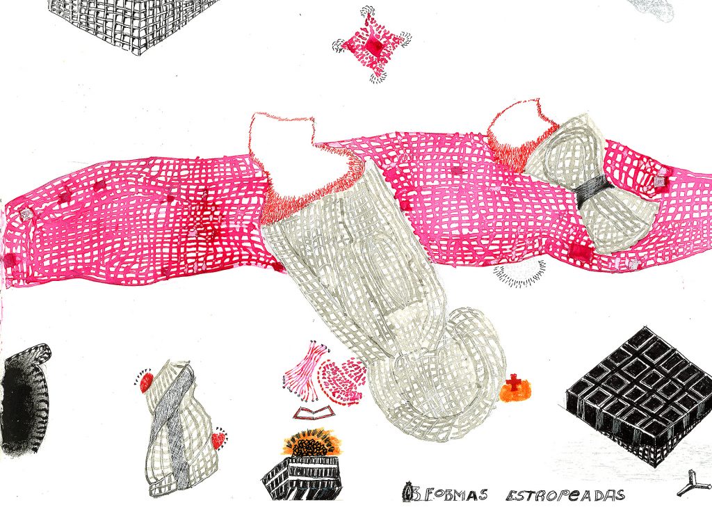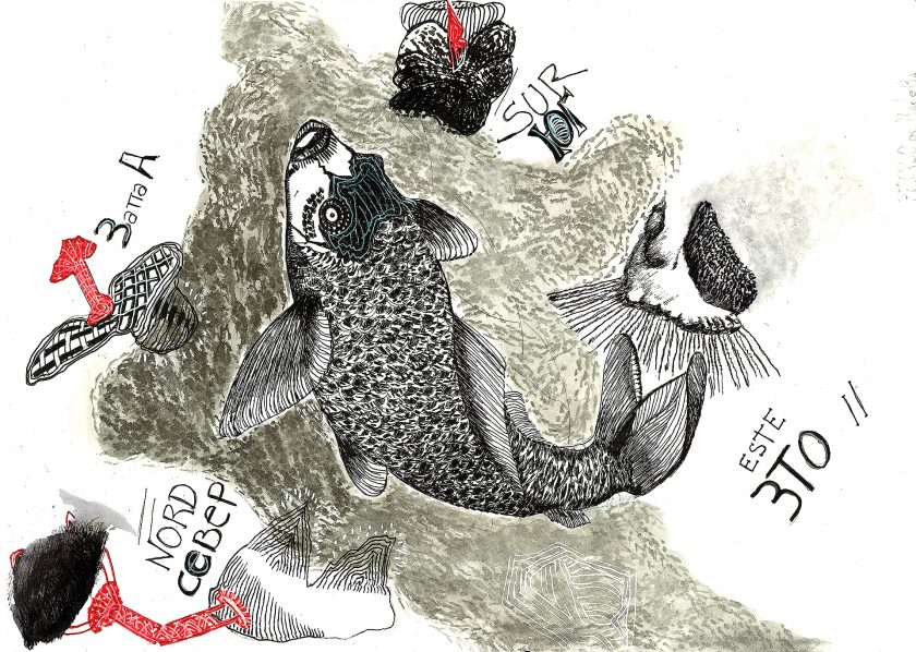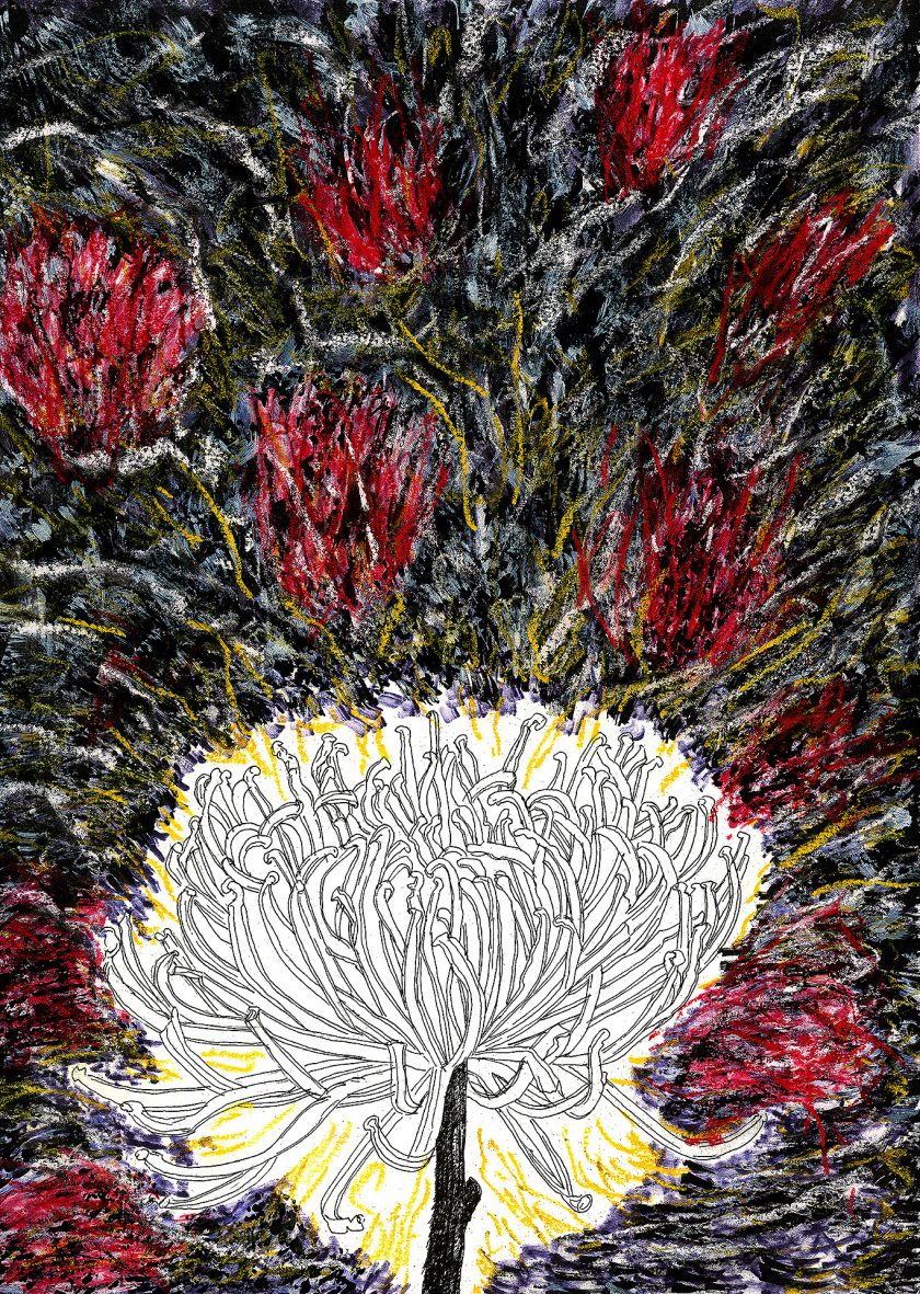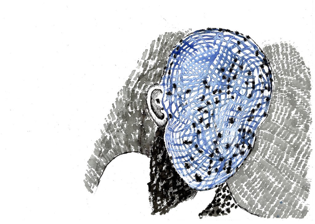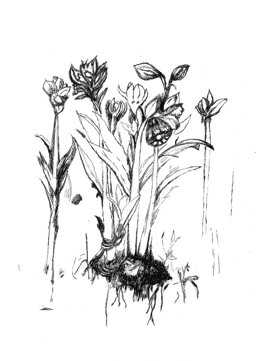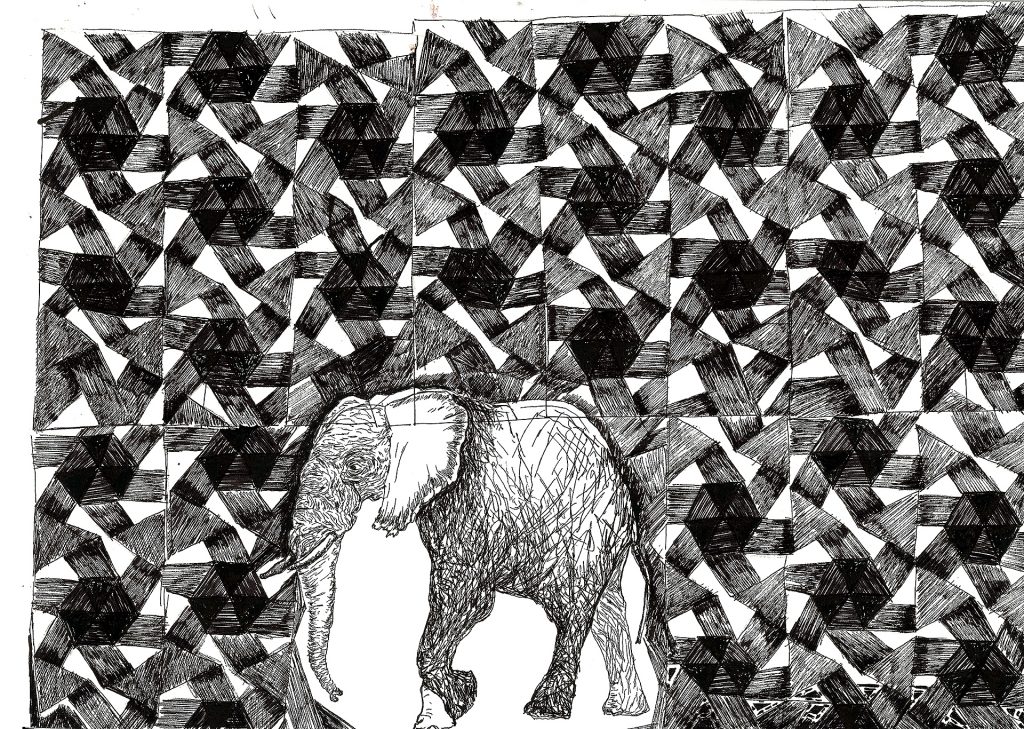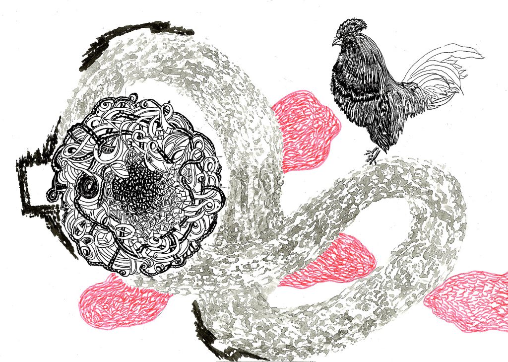 Encre de chine, charbon, crayon gras, feutre et stylo bille.